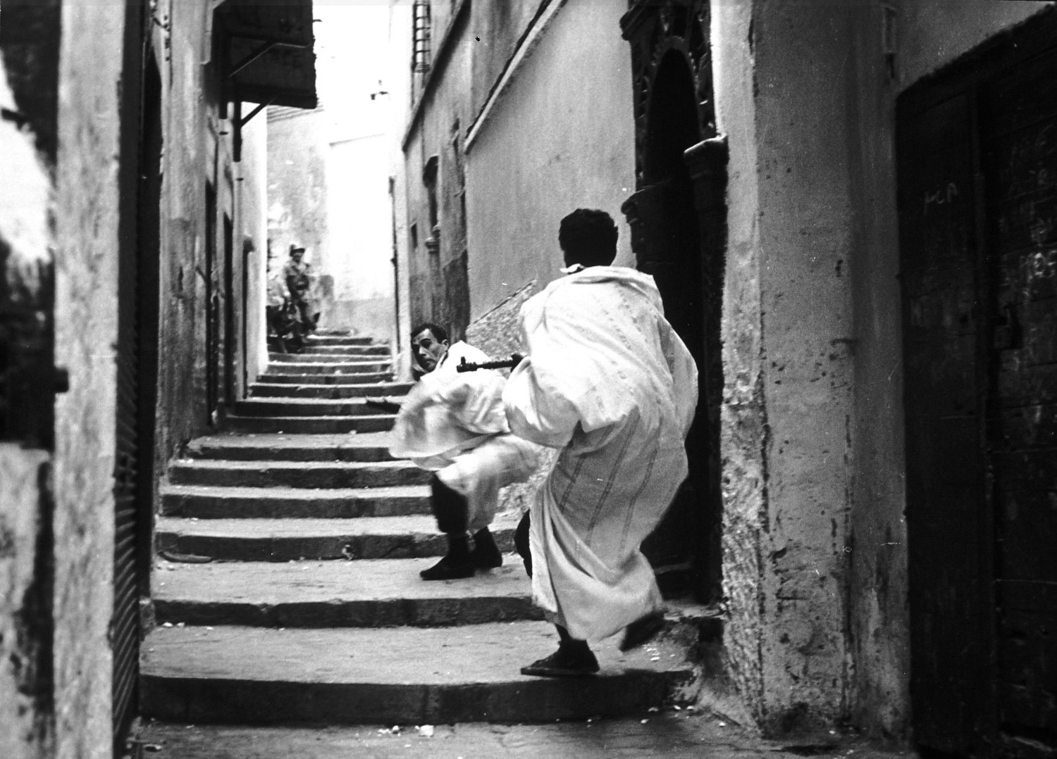 Via de behandeling van de personages komen we bij de volgende manier waarop de film tracht de historische werkelijkheid getrouw weer te geven. Afgewisseld met de wide shots zijn er vele close-ups en shots van menigtes. Hierdoor wordt de kijker middenin de drukte van de Kasba gezogen. Op het moment dat de terreur aanvangt maakt hij er onderdeel van uit, net als elk naamloos individu in de stroom mensen. Elk personage wordt summier gevolgd. Vaak begint geweld zonder dat men voldoende op de hoogte is van de redenen van dit geweld. De chaos van het gevecht wordt zo een cinematische beleving.